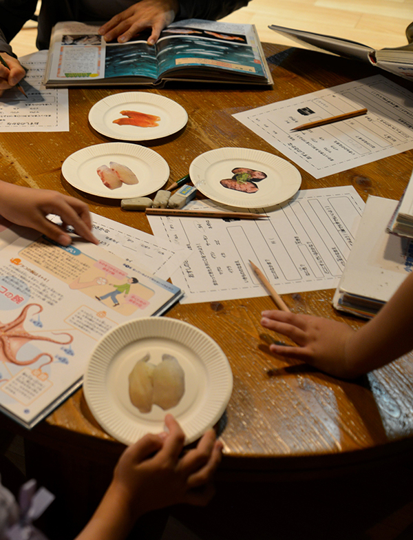【内容】塩蔵ワカメを水に浮かせながら広げて、陸の植物(野草)と色や形、手触りなどを比較しました。ワカメが水中で立ち上がることを確かめて、海の植物も陸の植物も成長のために水、日光、養分が必要であることを理解しました。また、海が深くなるほど日光が届きにくくなるため、深度によって異なる色の海そうが生息していることを簡単に説明しました。最後に、海そうも「おしば」にできること、私たちがいろいろな種類の海そうを食べていることを紹介しました。 今回は、観察して気付いたことをメモしたり、水・日光・養分などのシールを貼るワークブックを持ち帰りました。